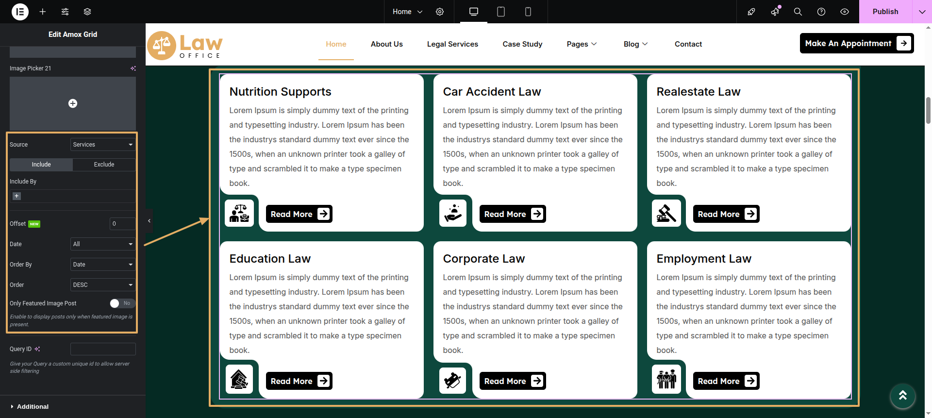 Post Widget After edit with elementor search for amox grid and in query part select services.