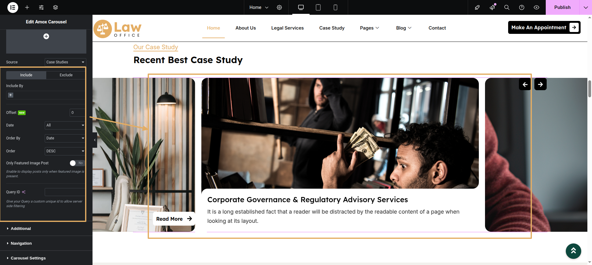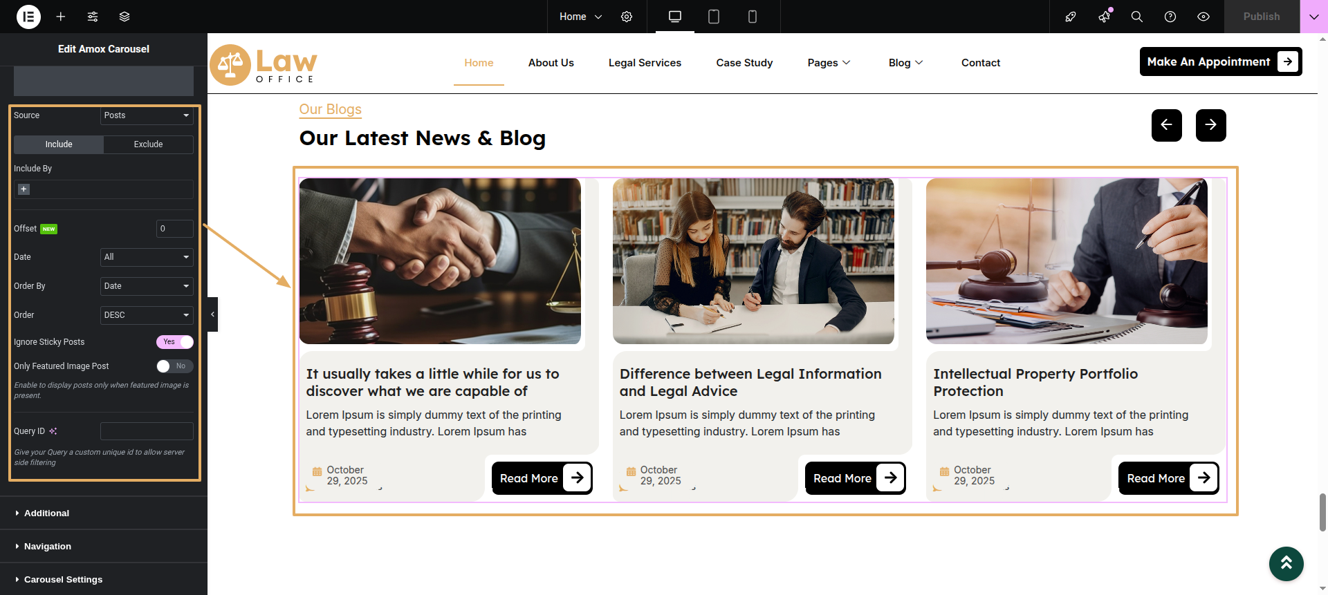 Next Progress while hitting "edit with elementor" Discover widget "Amox carousel" then add "Posts" in query Enable dtae from meta in widget" .