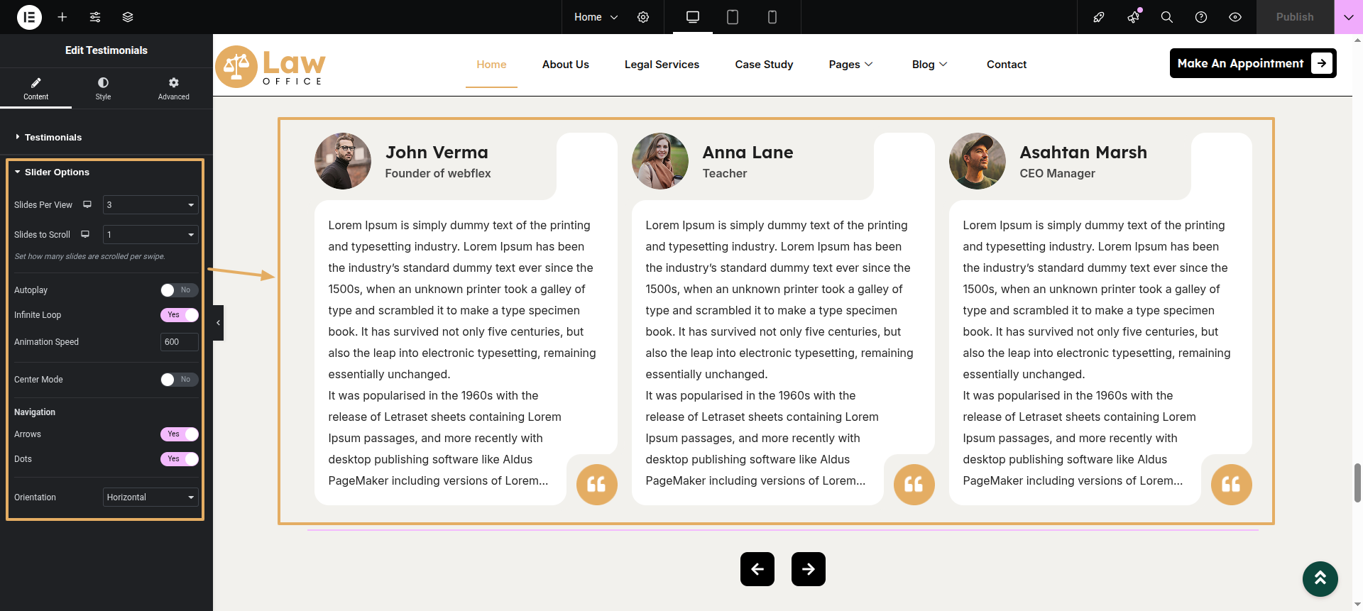 Slider options In slider options you can choose slides per view and enable or diable nav or pagination and adjust columns".