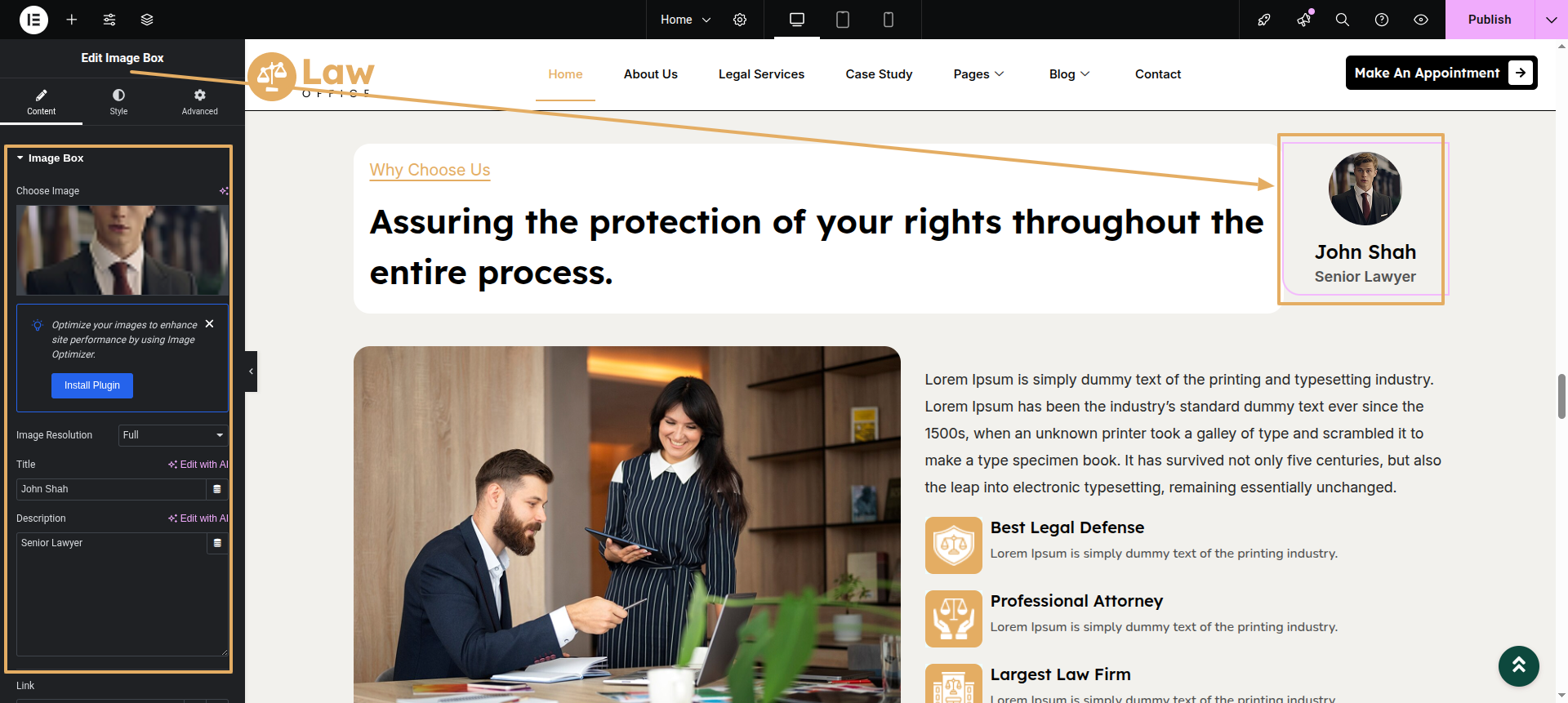 Initial Progress add image box from widgets" add image using image box then "add title" and lastly add text .