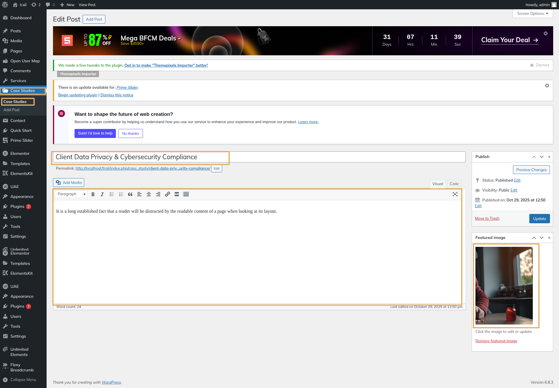 Next Progress while hitting "Dashboard" Discover "Cas studies" then "add new post Move forward "add heading, content and featured".