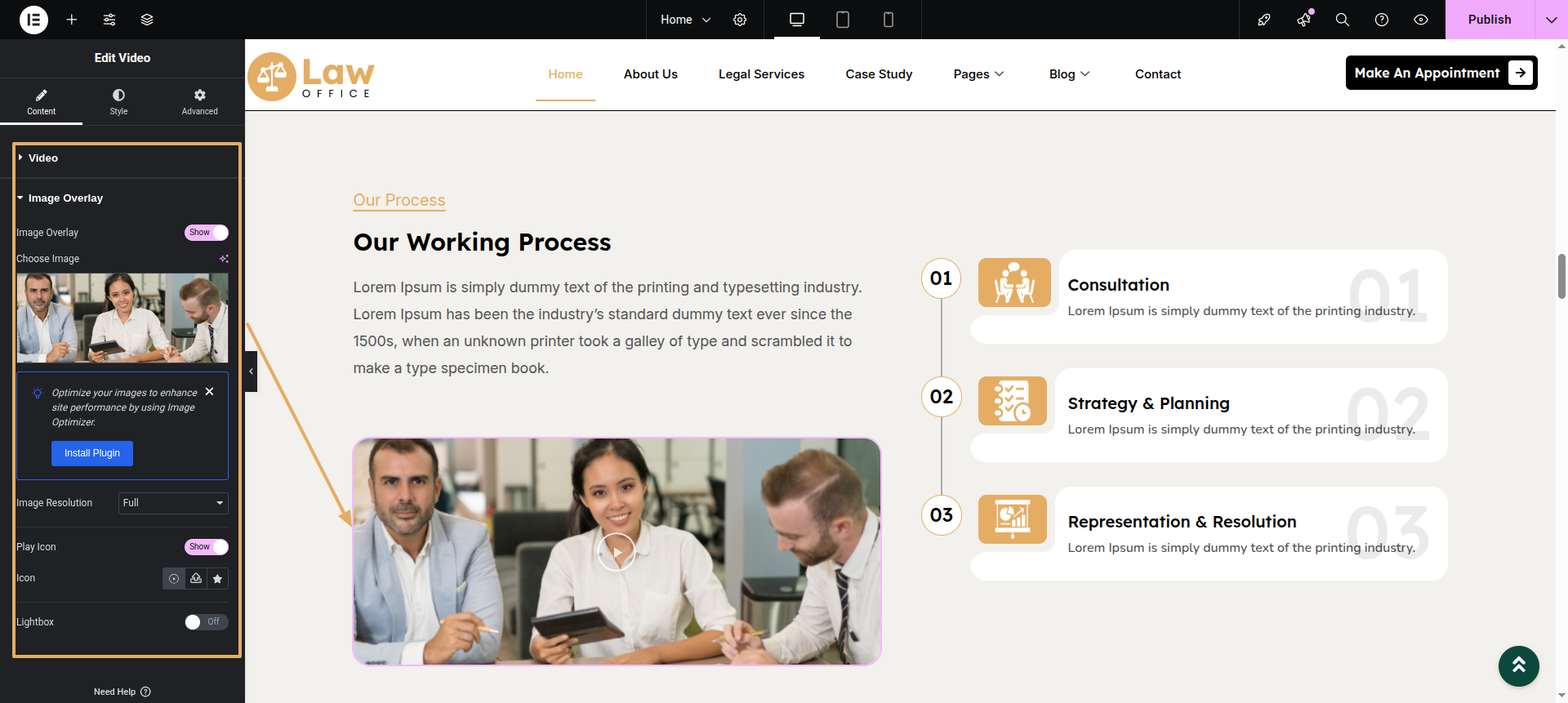 Video Add video widget, then in it place your video link and you can add image overlay if you want to change the thumbnail