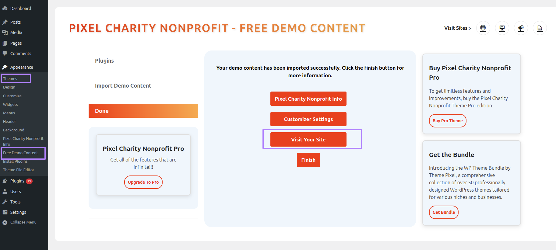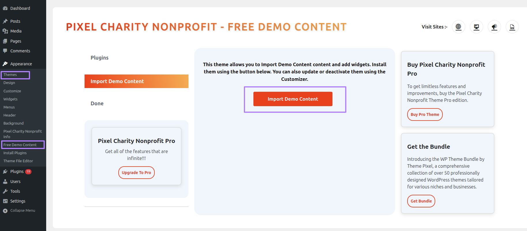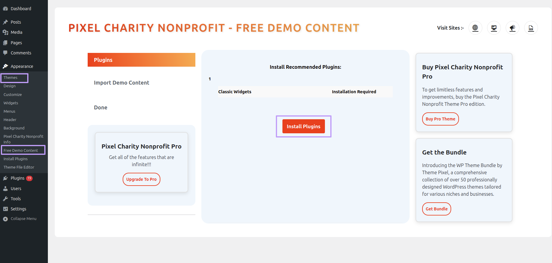 Initial Progress while hitting "Dashboard" Discover "Appearance" and lastly "Free Demo Content" previous tapping "Install Plugins" .