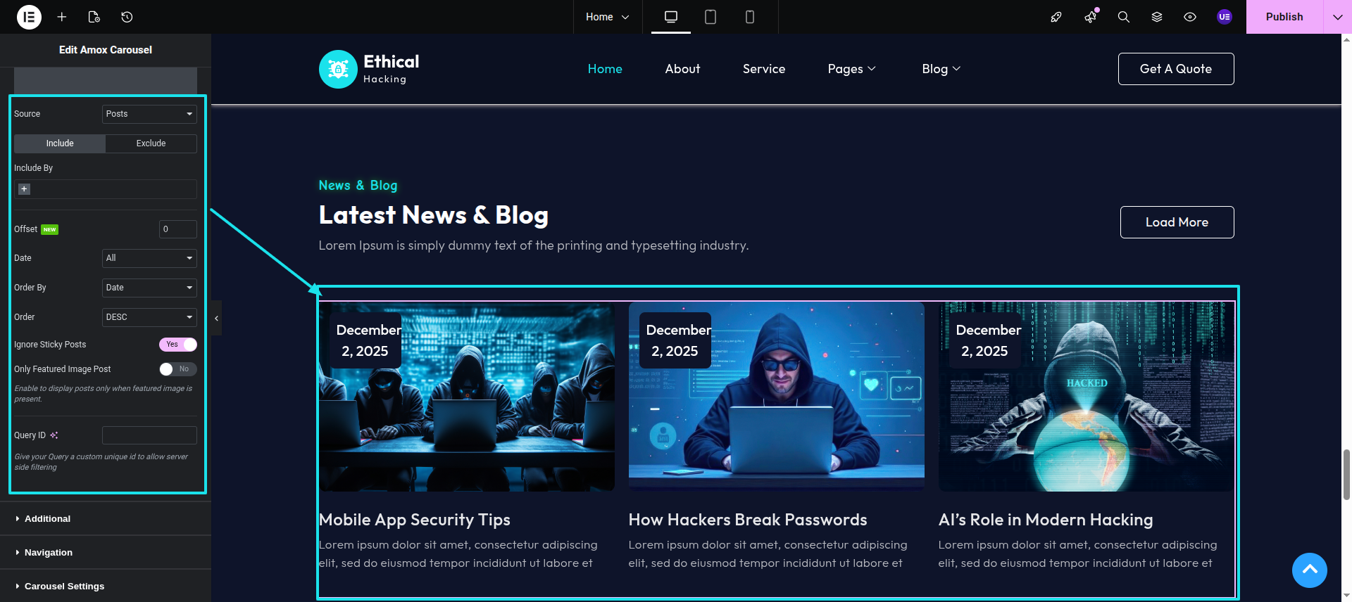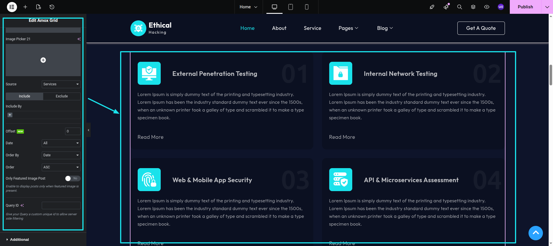 Post Widget After edit with elementor search for amox grid and in query part select services.