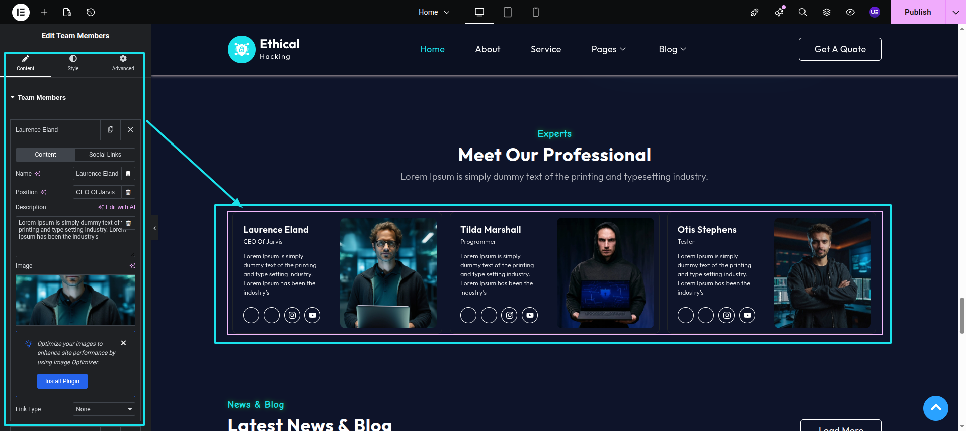 Initial Progress while hitting "edit with elementor" Discover "Team members" widget then add "Name and designation" Move forward "to add member image".