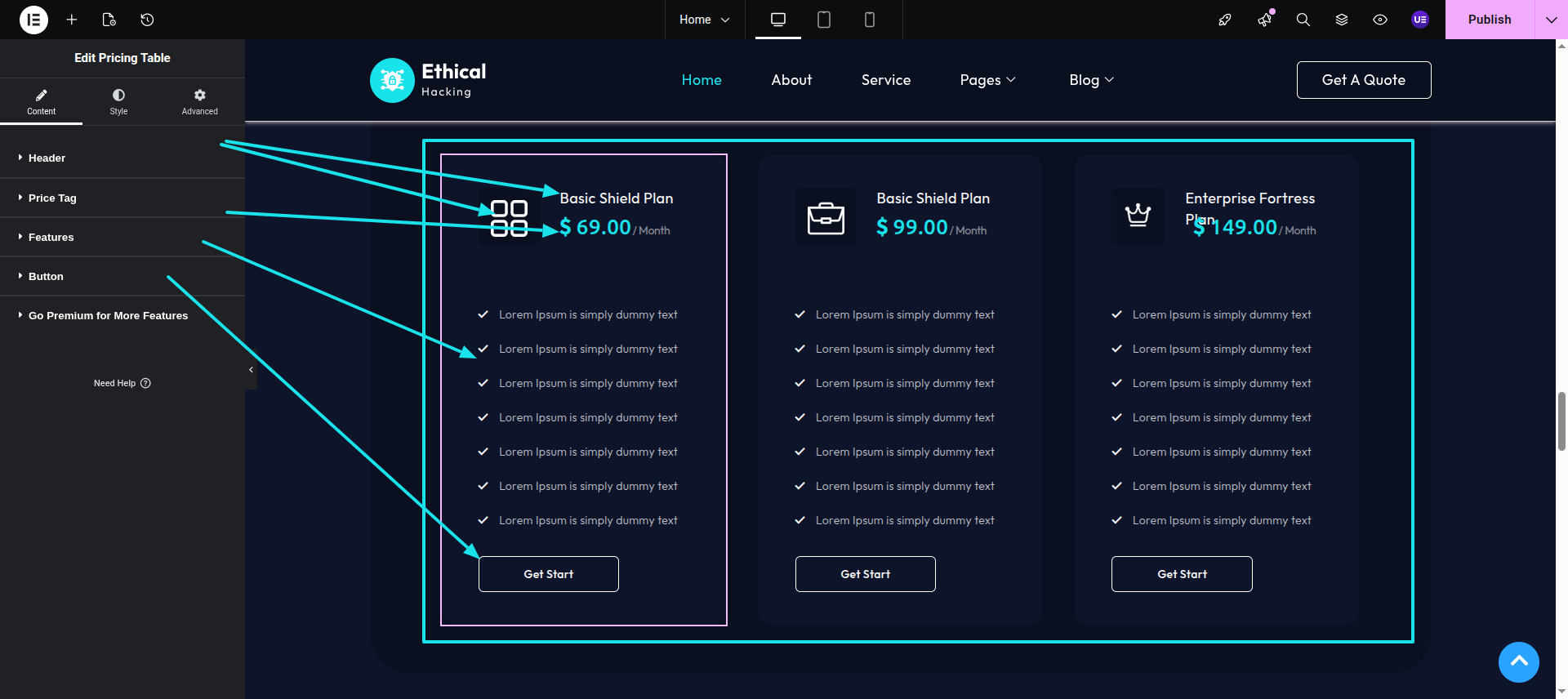 Initial Progress while hitting "edit page with elementor" Discover "Pricing Table in widgets" then "add your desired data as shown in the image" .