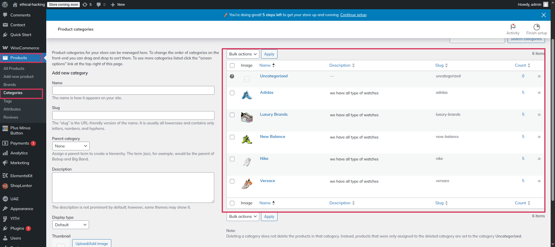 Initial Progress while hitting "Dashboard" Discover "Products" in it discover "Categories" then "add new category" Move forward "add heading, content and featured"