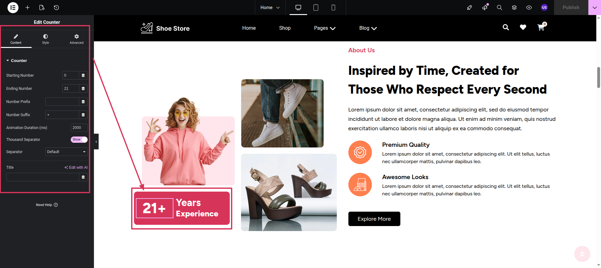 Counter and Heading while hitting "Dashboard" Add your desired text using Conter widget and Heading using Heading widget." .